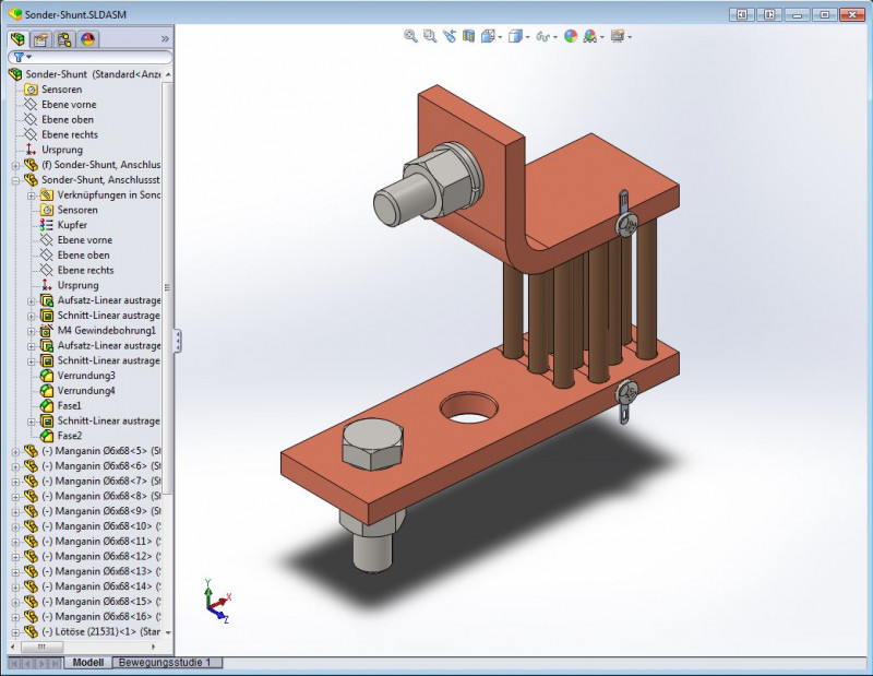 Aufgrund unseres eingerichteten Maschinenparks sind wir ebenso in der Lage, spezielle Sonderbauformen hinsichtlich Größe und Form eines Nebenwiderstands nach individueller Kundenspezifikation zu produzieren. Im Idealfall erfolgt dies nach kundenseitiger Vorlagezeichnung. Gerne übernehmen wir auch die Dimensionierung und Konstruktion eines Sondershunts nach Ihren Vorgaben hinsichtlich elektrischer Kenngrößen und baulichen Vorstellung. In unserer Konstruktion erstellen wir am CAD eine 3D-Maßzeichnung.