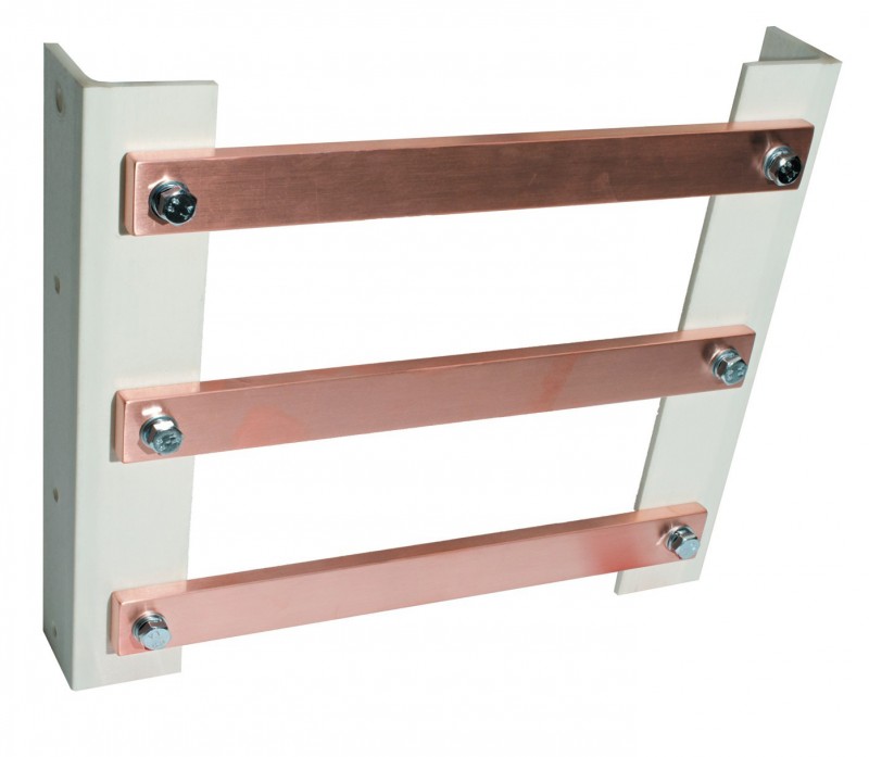 These L-shaped supports are used for mounting 10 mm copper bus bars horizontally (three phases; one or two bars per phase).
